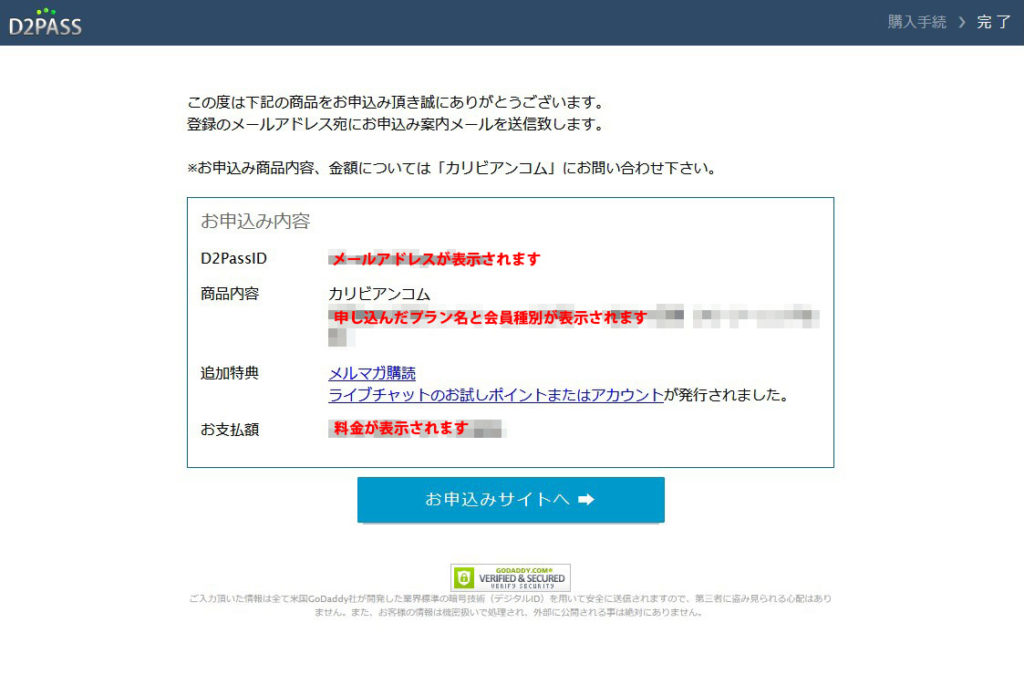 下の画面が表示され購入確認メールが届けば入会手続きは完了です。おめでとうございます!