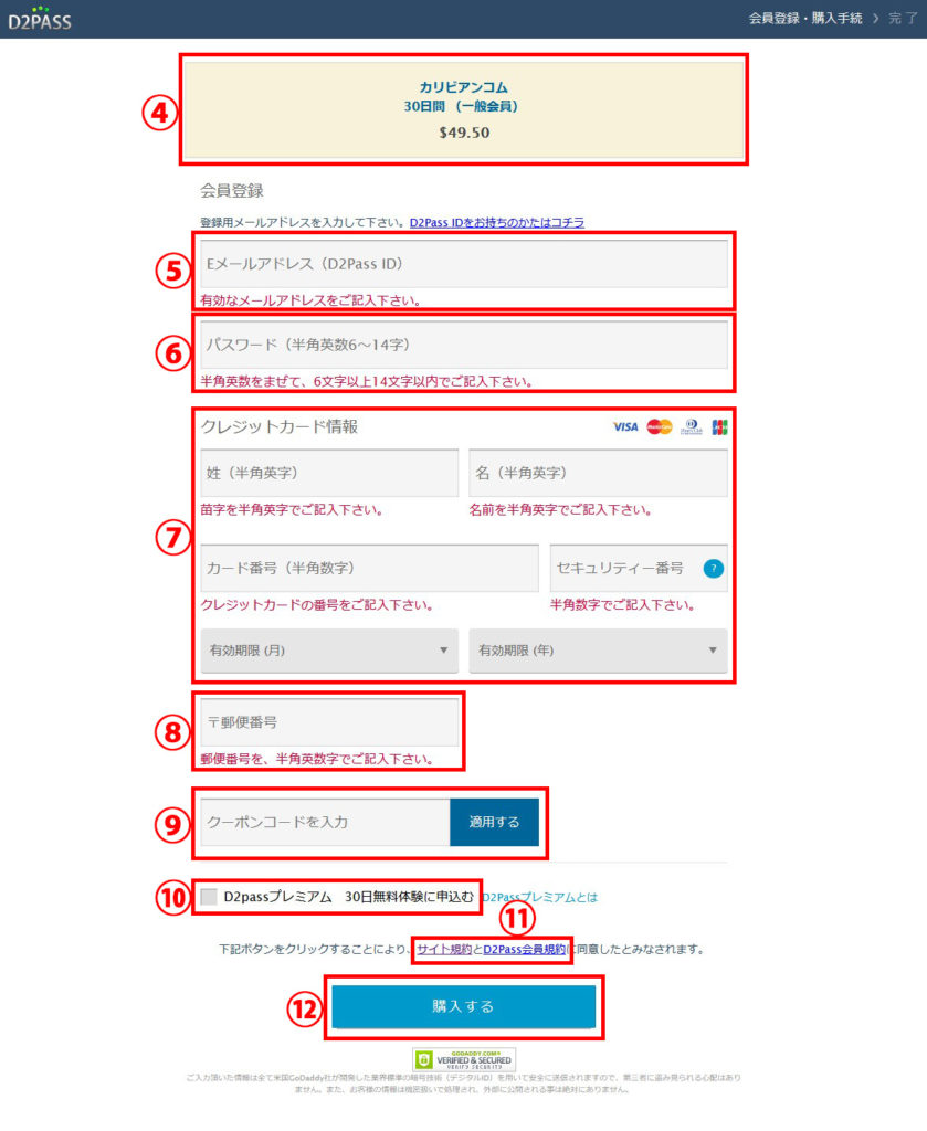 ⑩D2passプレミアムに申し込みたい場合はチェックを入れる